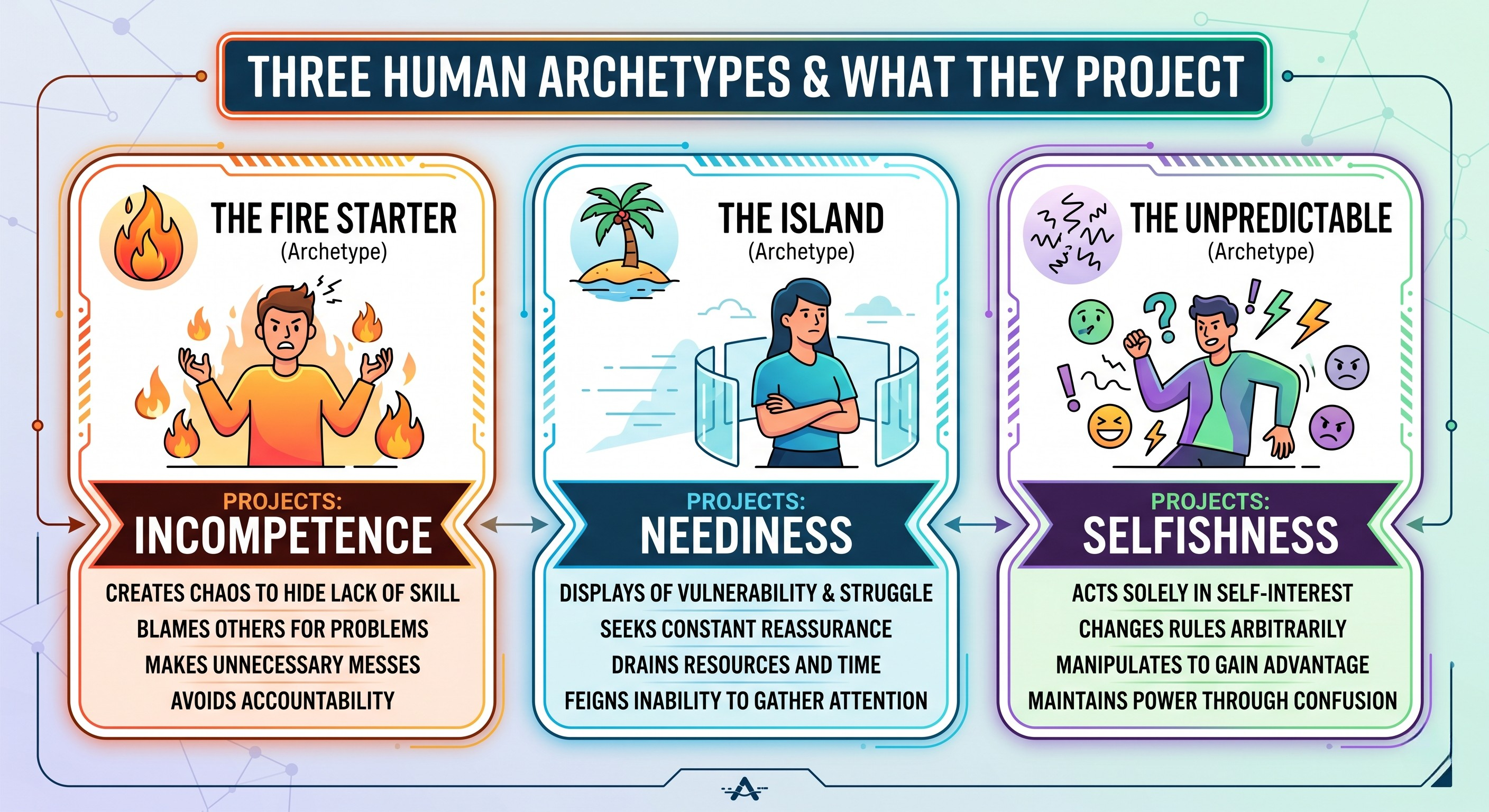 In the nervous system framework I use with clients, we work with three primary archetypes — the Fire Starter, the Island, and the Unpredictable. Each one has a signature shadow projection.